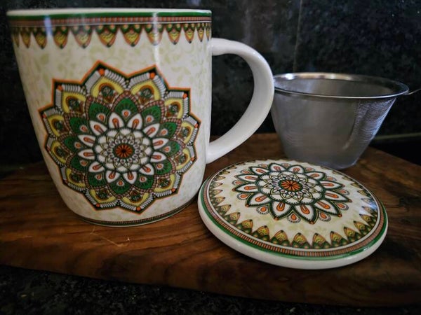 Kleurrijke thee mok met bijpassend deksel en roestvrijstalen theezeefje, in een kartonnen verpakking.