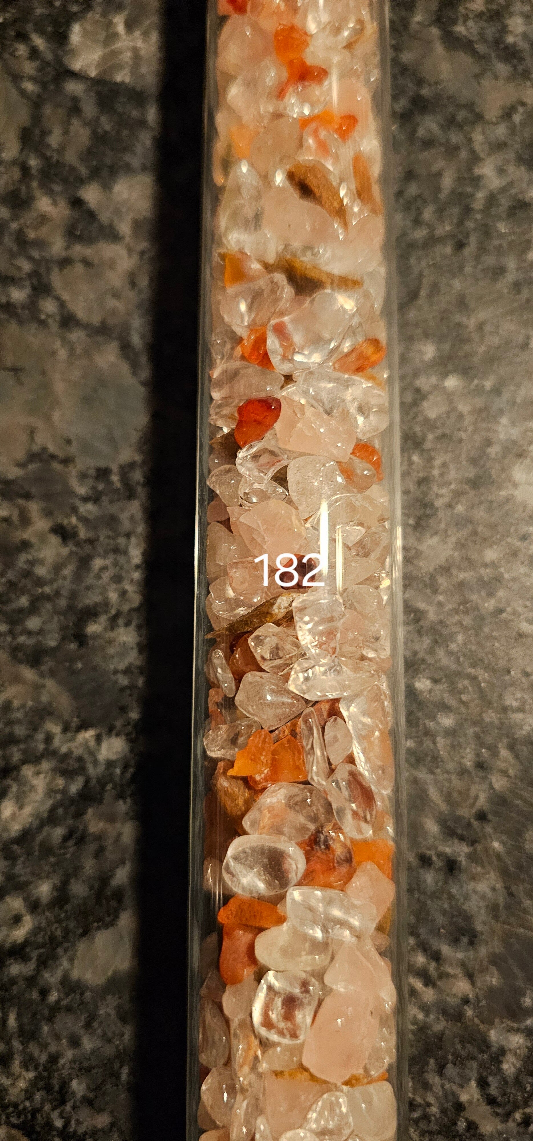 Met carneool, oranje jaspis, bergkristal en rozenkwarts.