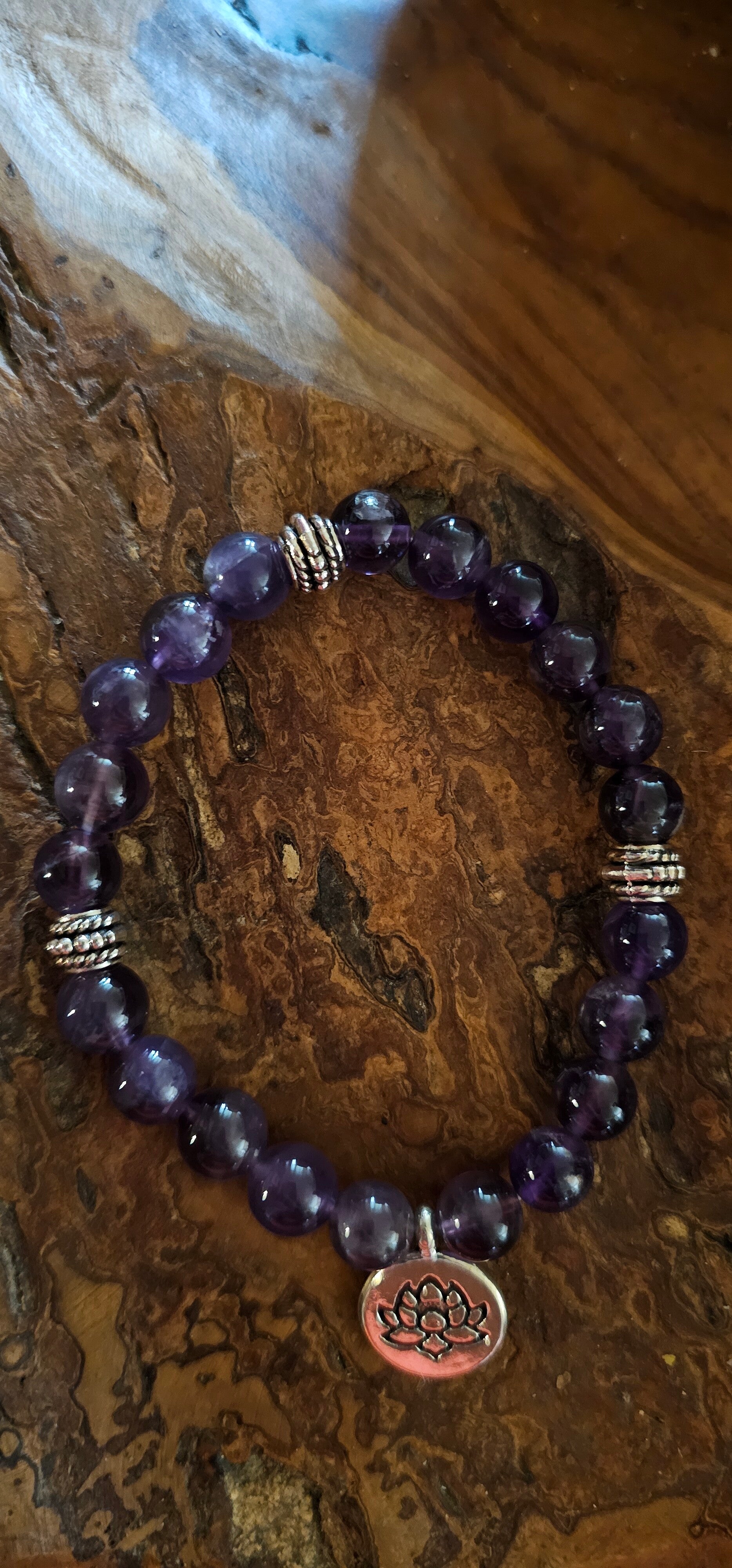 Elastische mala/armband met 21 kralen van amethist met lotus symbool.*