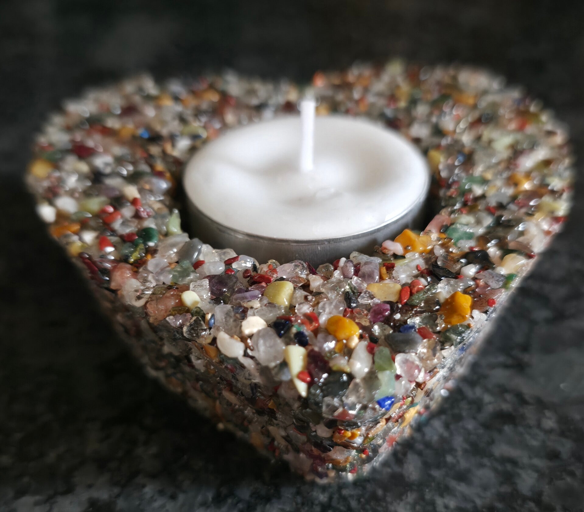 Hartvormige theelichthouder gemaakt van een assorti mix van deze mineralen en edelstenen: amazoniet, amethist, bergkristal, carneool, citroenkwarts, howliet, mosagaat, rozenkwarts, rode jaspis, rookkwarts, sodaliet, tijgeroog en zwarte obsidiaan.